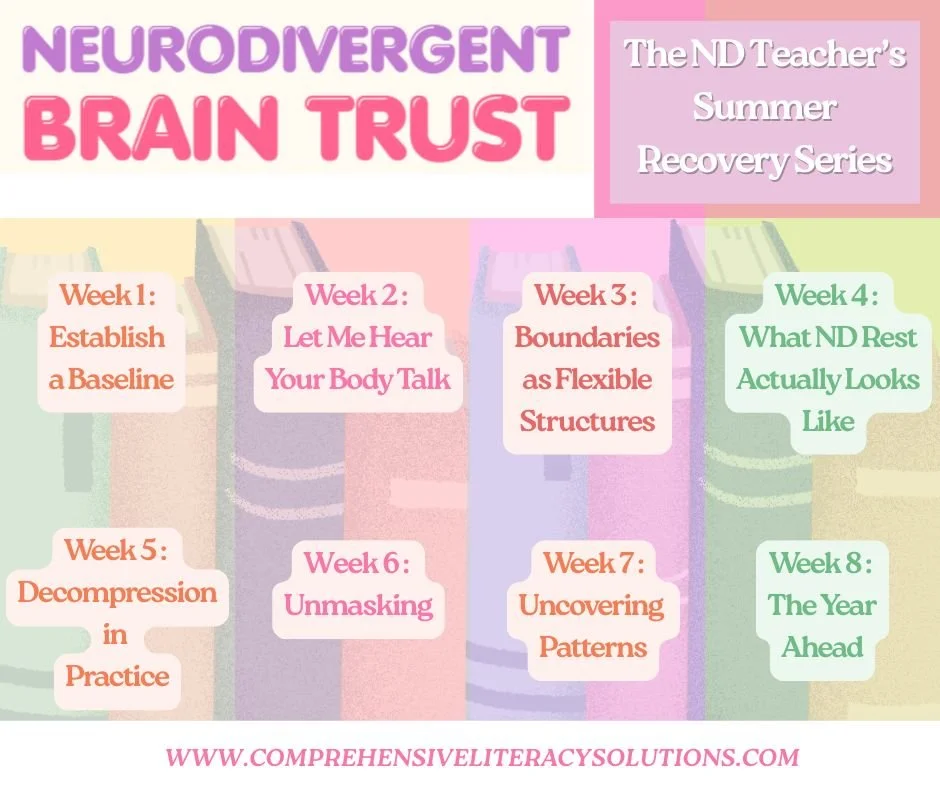 An image of an outline of the ND Teacher’s Summer Recovery Journal Series. Week 1: Establish a Baseline, Week 2: Let Me Hear Your Body Talk, Week 3: Boundaries as Flexible Structures; Week 4: What ND Rest Actually Looks Like; Week 5: Decompression in Practice; Week 6: Unmasking; Week 7: Uncovering Patterns; Week 8: The Year Ahead.